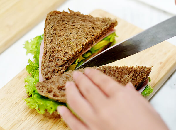 Cắt đôi bánh sandwich thành hai khối tam giác tiện dùng.