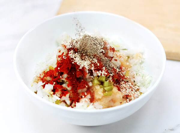 Cho Ức gà xay, hành tây và dưa chuột muối băm nhuyễn, thêm muối, hạt nêm và ớt bột parika vào trộn đều.