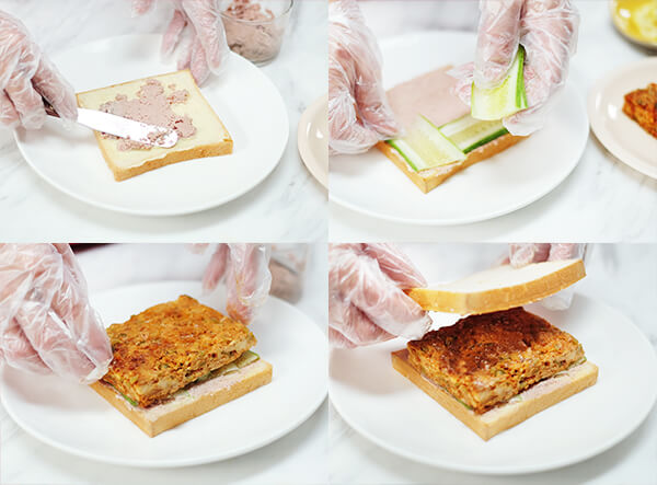 Phết pate, mayonaise lên lát sandwich, thêm dưa leo thái mỏng và nhân gà đã chiên vào