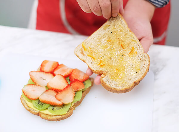 Chỉ cần phết mứt lên mặt bánh sandwich rồi cho trái cây lên trên, kẹp lại, thế là xong, thật đơn giản phải không nào!