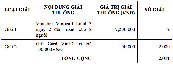 - Lần 1: 3 giải Voucher Vinpearl Land 3 ngày 2 đêm dành cho 2 người, trị giá 7.200.000đ/giải