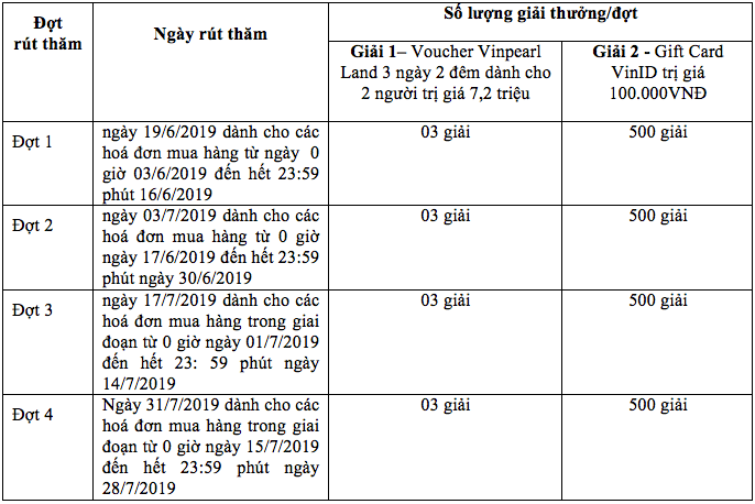 • Lịch rút thăm và cơ cấu giải thưởng cho từng đợt như sau, tại TTTM Times City, 458 Minh Khai, Hai Bà Trưng, Hà Nội với sự tham dự của Ban Giám Sát là đại diện  của công ty Neslté Việt Nam và đại diện Công Ty Cổ Phần Dịch Vụ Thương Mại Tổng Hợp Vincommerce..